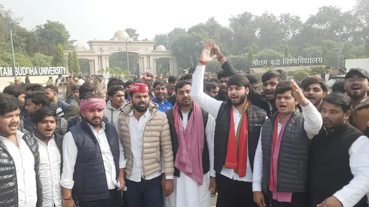 Gautam Buddha University में कथित तौर पर नियुक्तियों और फीस से जुड़ी अनियमितताओं को लेकर सोमवार को माहौल गर्म हो गया। समाजवादी छात्र सभा के बैनर तले बड़ी संख्या में छात्र विश्वविद्यालय के मुख्य गेट पर इकट्ठा हुए और प्रशासन के खिलाफ जोरदार प्रदर्शन किया।